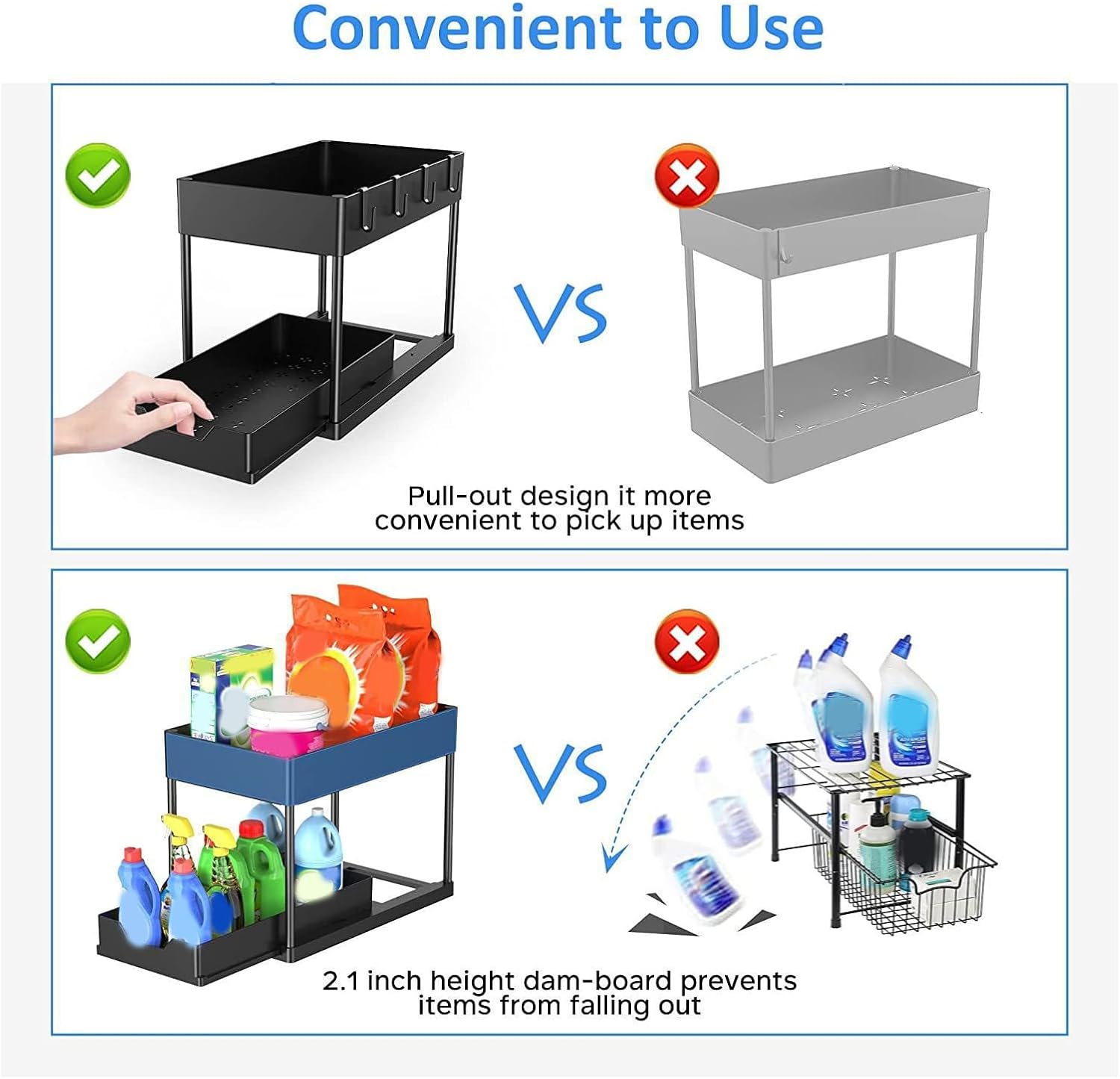 2pcs Under Counter Sliding Storage Rack Pull Out Cabinet Organizers 2 Tiers Slide Out Sink Shelf Cabinet Storage Shelves Features: Adjustable length slide out shelf easily fits under different sized kitchen sinks, solving the problem of fixed racks not fitting various layouts Perfect for small apartments or large kitchens with its adaptable structure Comes with 10 sturdy hook providing extra storage space for hanging tools, cloths and other kitchen essential Ideal for compact living spaces needing efficient organization Make of good that prevents rusting in humid environments Specially designed for damp areas under sinks, ensuring long term durability without deformation Requires without tool for quick setup, eliminating complicated assembly steps Perfect for renters or those who moves frequently with easy disassembly and reinstallation capabilities Maximizes unused space under sinks to solve countertop clutter problems An organizational must have for modern households seeking efficiency, making every cooking more Specifications: Dimension: 21x39.5x36cm / 8.26×15.55×14.17in Component: plastomer Package Includes: 2pcs Under Sink Pull Out Storage Rack Note: 1.Please allow 1-2cm errors due to manual measurement, making sure that you will not mind before order 2.Due to the differences between different monitors, the picture may not reflect the actual color