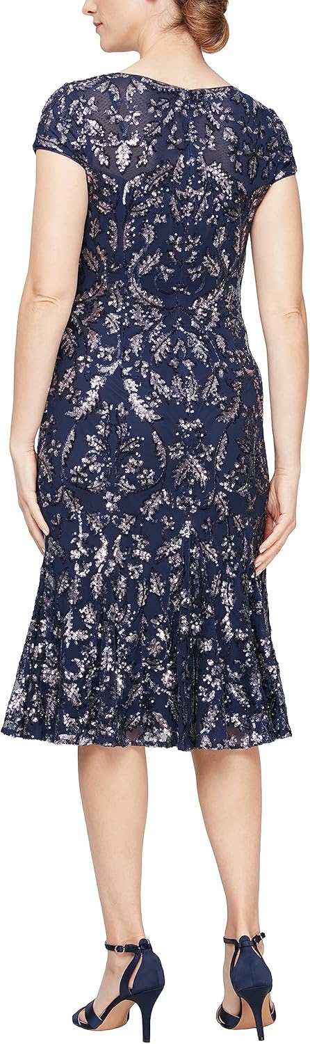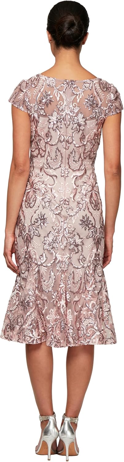 Introducing the Alex Evenings Women's Tea Length Embroidered Cocktail Dress with Godets, the perfect ensemble for wedding guests and partygoers. This exquisite dress features intricate embroidery and sequin details, creating a sophisticated and captivating look. The fit and flare silhouette, enhanced by godet inserts, accentuates your curves while providing a graceful, flowing movement. With its tea length hemline, this dress offers a classic elegance that's ideal for any special occasion. Designed for both comfort and style, you'll feel confident and glamorous, making a lasting impression at every event. Embrace timeless beauty with the Alex Evenings Embroidered Cocktail Dress.