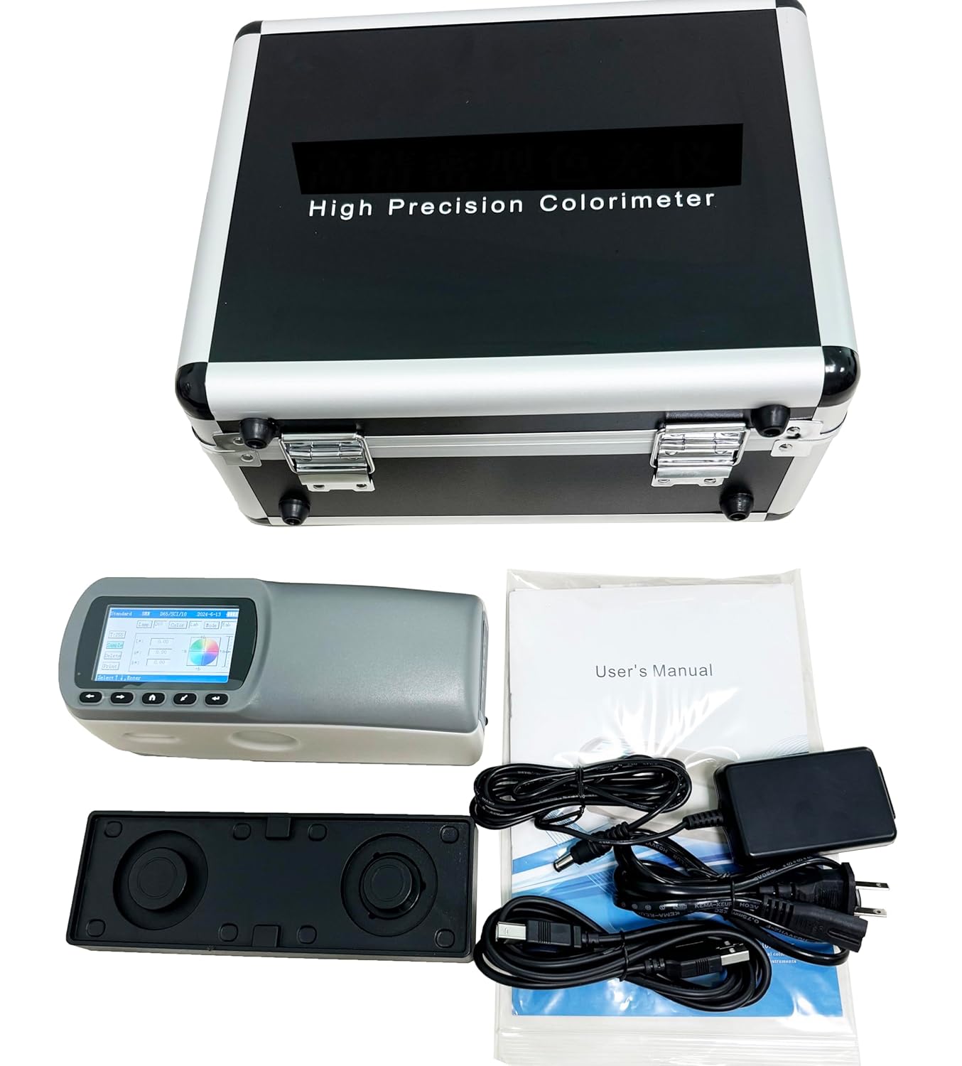 Introduction This high precision colorimeter is developed and produced according to the international standard of CIE and GB. By adopting the latest 8/d optical configuration and equipped with sensor of high sensitivity. It has a high reproducibility and stability. Technical Specifications Optical geometry: 8/d, equipped with SCI and SCE Synchronous test mode Measure caliber: 8MM Observer: 2°& 10° Sensor: Silicon photodiode array System language: Simplified Chinese,Traditional Chinese, English Repeatability: Standard deviation △E﹡ab≤ 0.06( Using the standard whiteboard to measure 30 times and take the average.) Display: Value of chromatism, chromatic value, color space figure, qualified/ unqualified determination color analysis Observing light source: D65 D50 C A F2 F8 F11 Color space figure: L* a* b、L* c* h、Yxy、RGB Color difference formula:△E* ab、△E* ch Power source: Special 3200 mAh large-capacity lithium battery, AC adapter Data storage: 20000 groups Dimension: 196×71×93(L×W× H) Weight: 660g(including the calibration boards) Connection: USB Scope of application Color matching in industry and quality control in production process. Color-difference detection and color-difference bath control in production process. Color-difference analysis of spray paint surface and electroplate surface. Color-difference of different areas of the metal treating surface. Quality control in color difference in sample and the standard. Color difference inspection of batch products in outdoors. On-line monitoring of color difference in production process. Color analysis testing in other special industry etc.