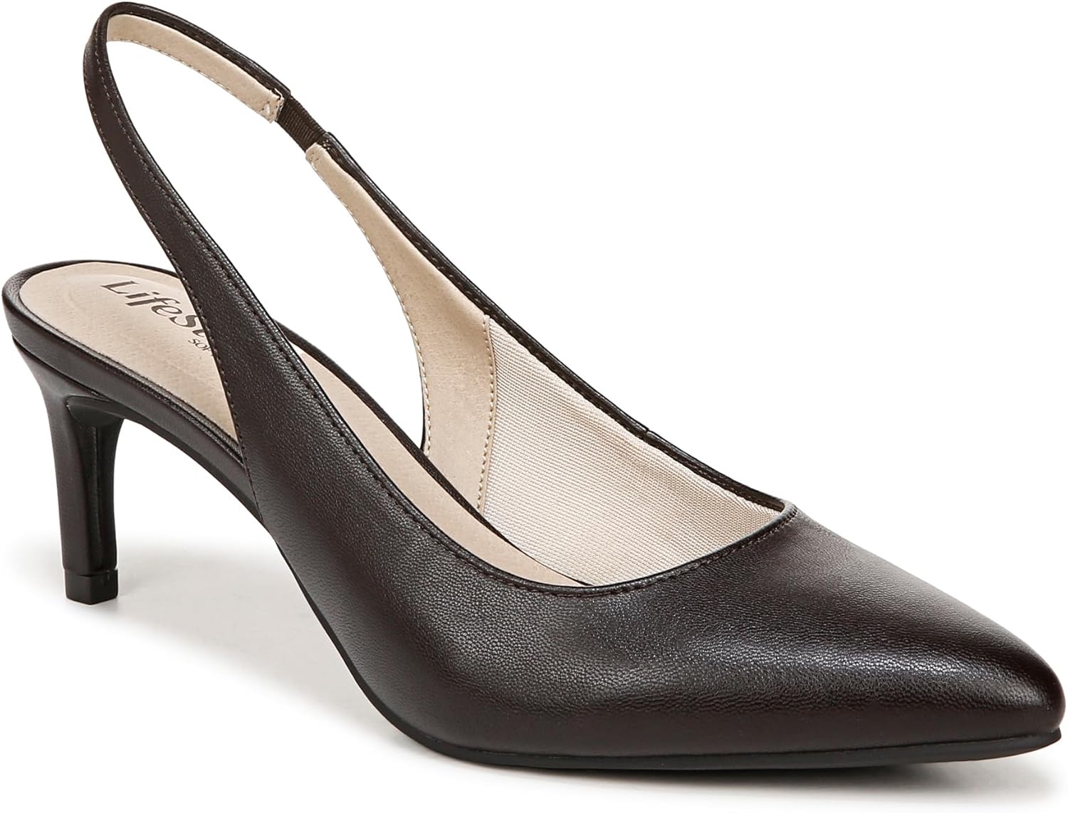 The classic slingback with a modern twist. Wear these comfortable women’s heels and take on your day with confidence. Faux leather or microfiber upper, softly pointed toe, and slingback strap with built-in stretch for the perfect fit. Linings crafted from partially recycled materials. Soft System® comfort package provides all-day support, flex, and cushioning. Traction sole for extra stability. Just Right Height 2 3/8 inch heel.